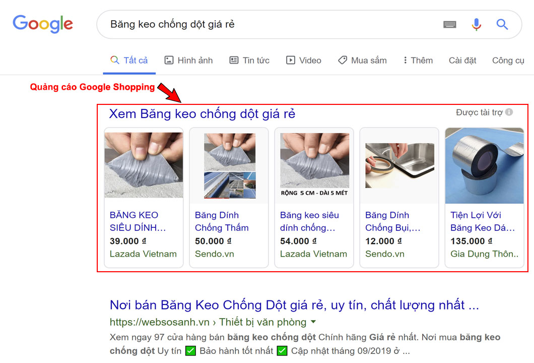 - Quảng cáo hiển thị danh sách sản phẩm lên trang nhất kết quả tìm kiếm của Google